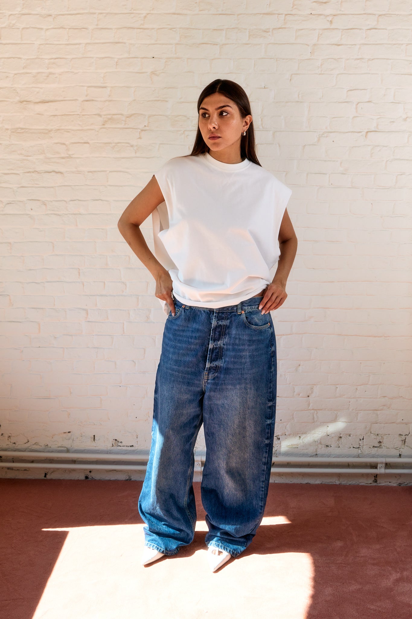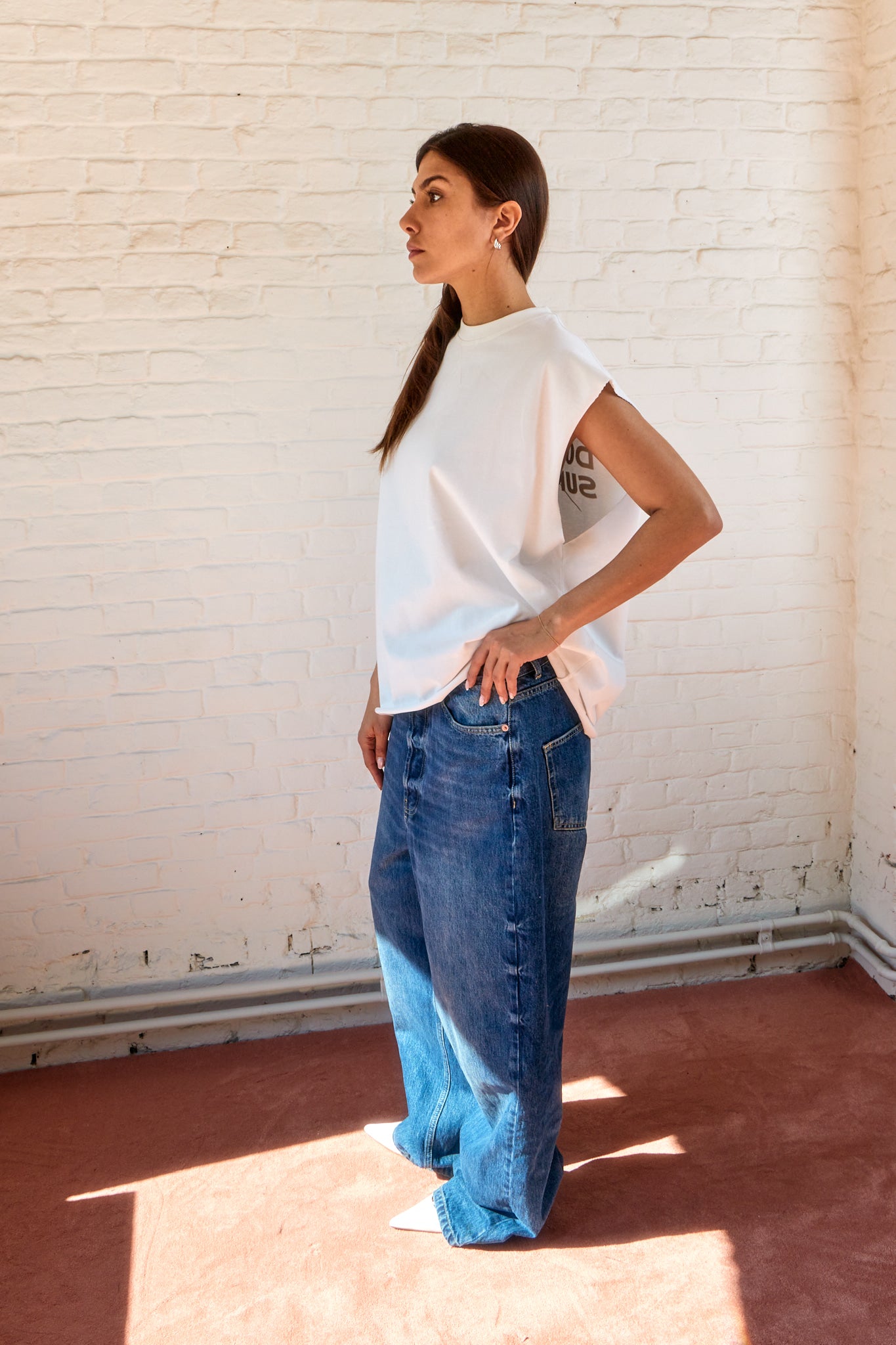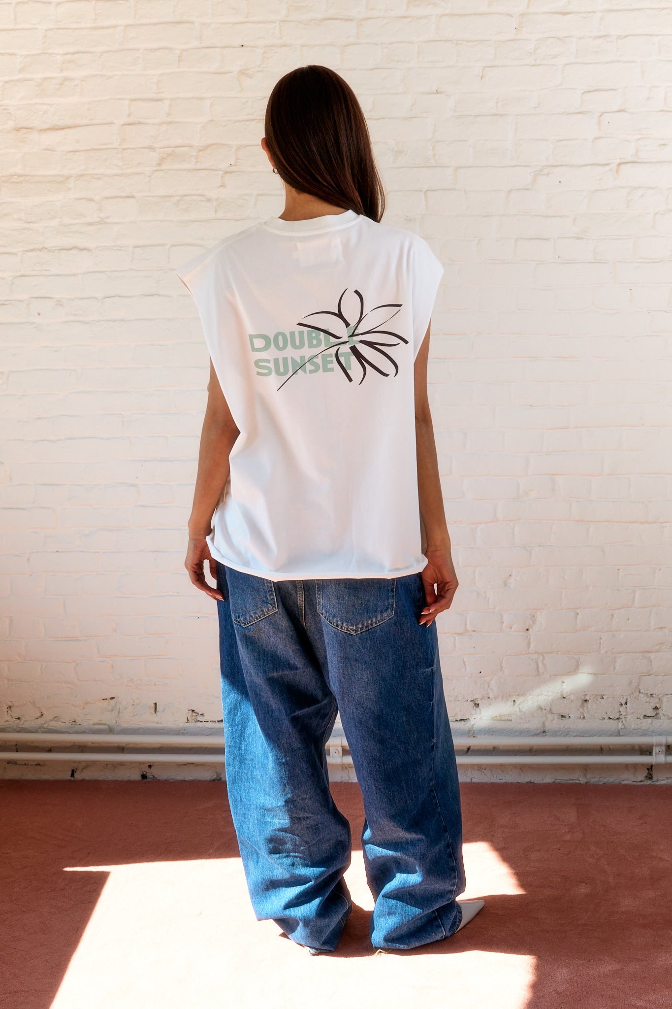 An oversized sleeveless t-shirt with our double sunset logo on the back. The oversized design adds depth and character to the design.