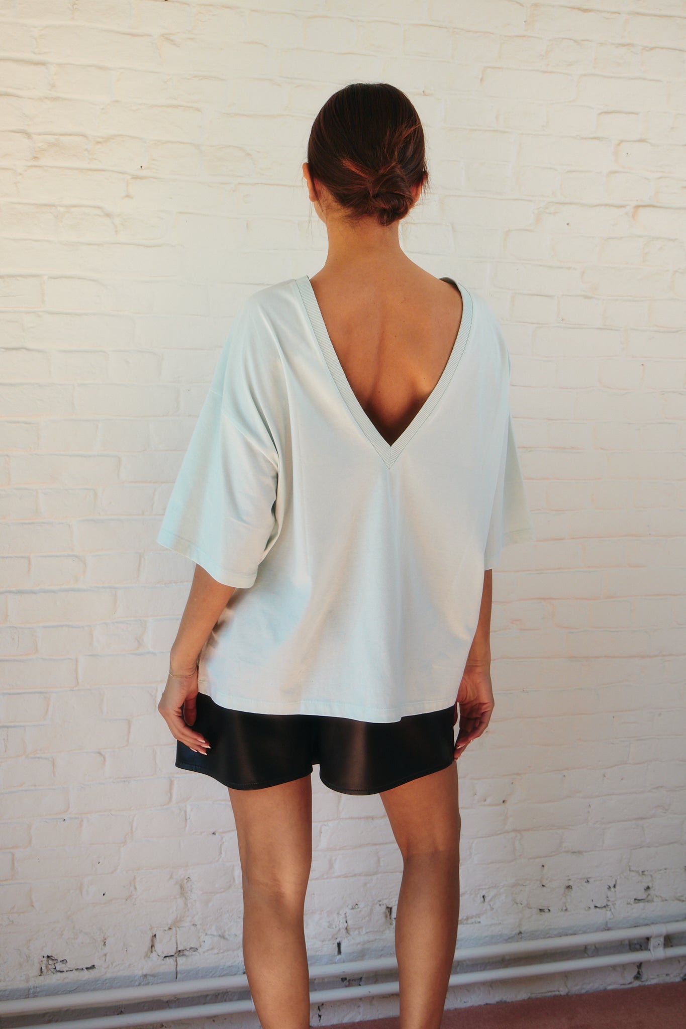 An oversized t-shirt with a deep V-neck at the back for an elegant touch. The front features an exclusive in-house illustration, adding a unique flair.