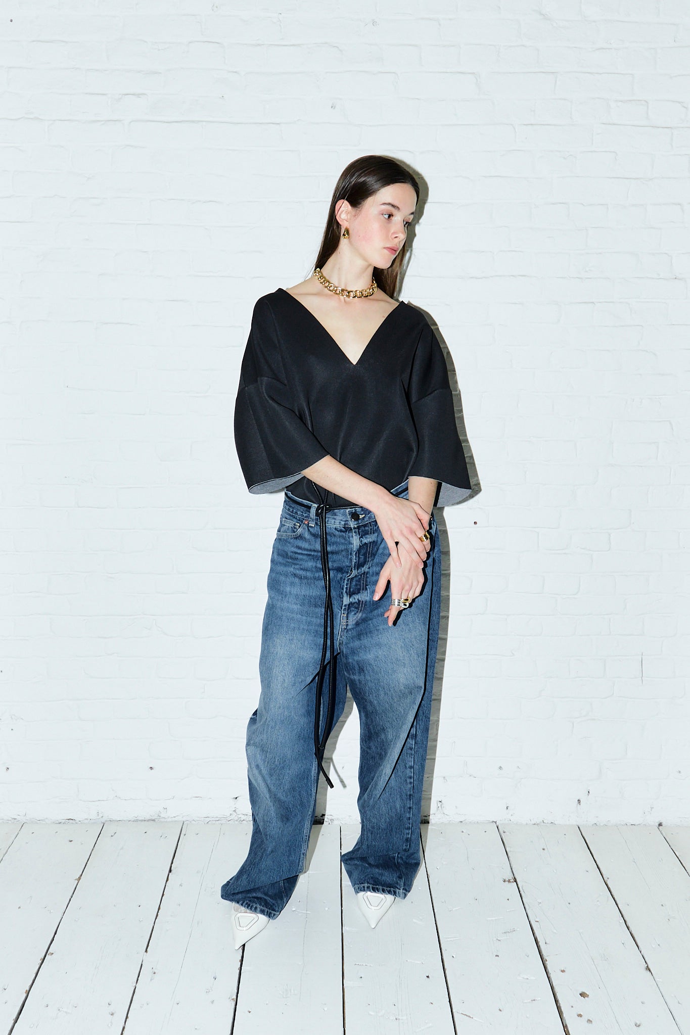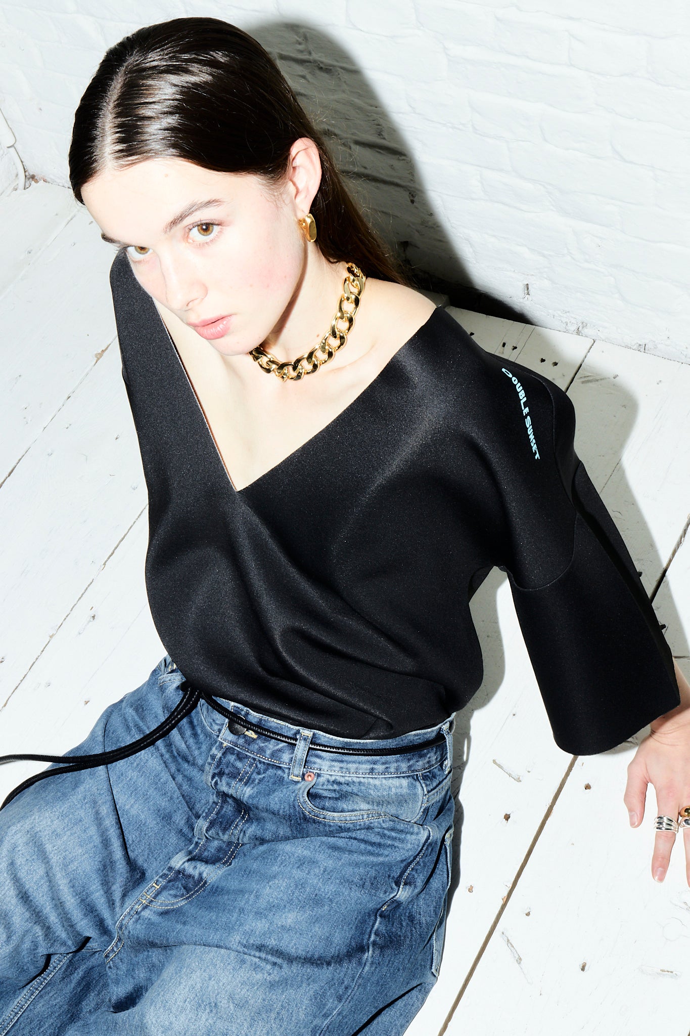 An oversized deep V-neck t-shirt, designed for a loose fit. The front shoulders feature our Double Sunset logo.